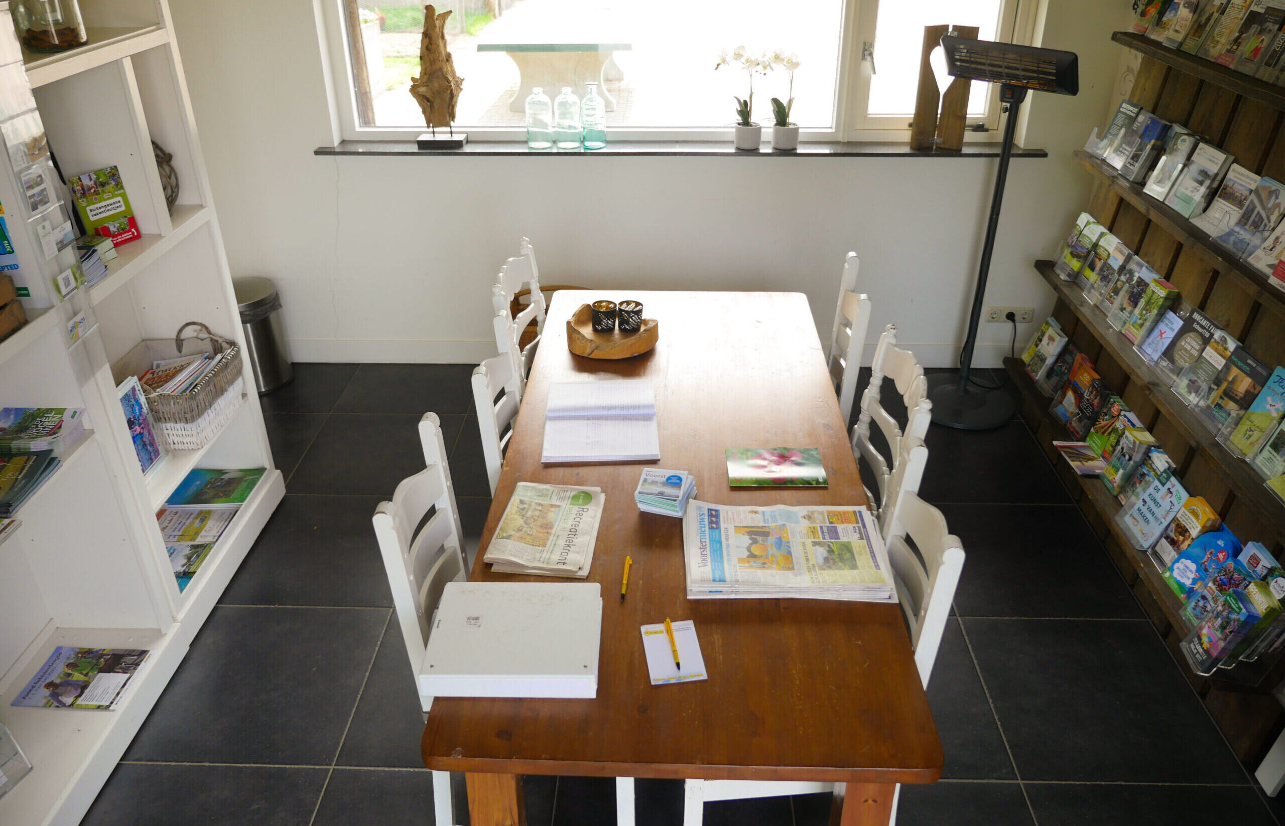 Verwarmde huiskamer met keukentje, fiets- en wandelroutes, veel informatie over de omgeving, een minibieb, spelletjes, tijdschriften en gastenboek.